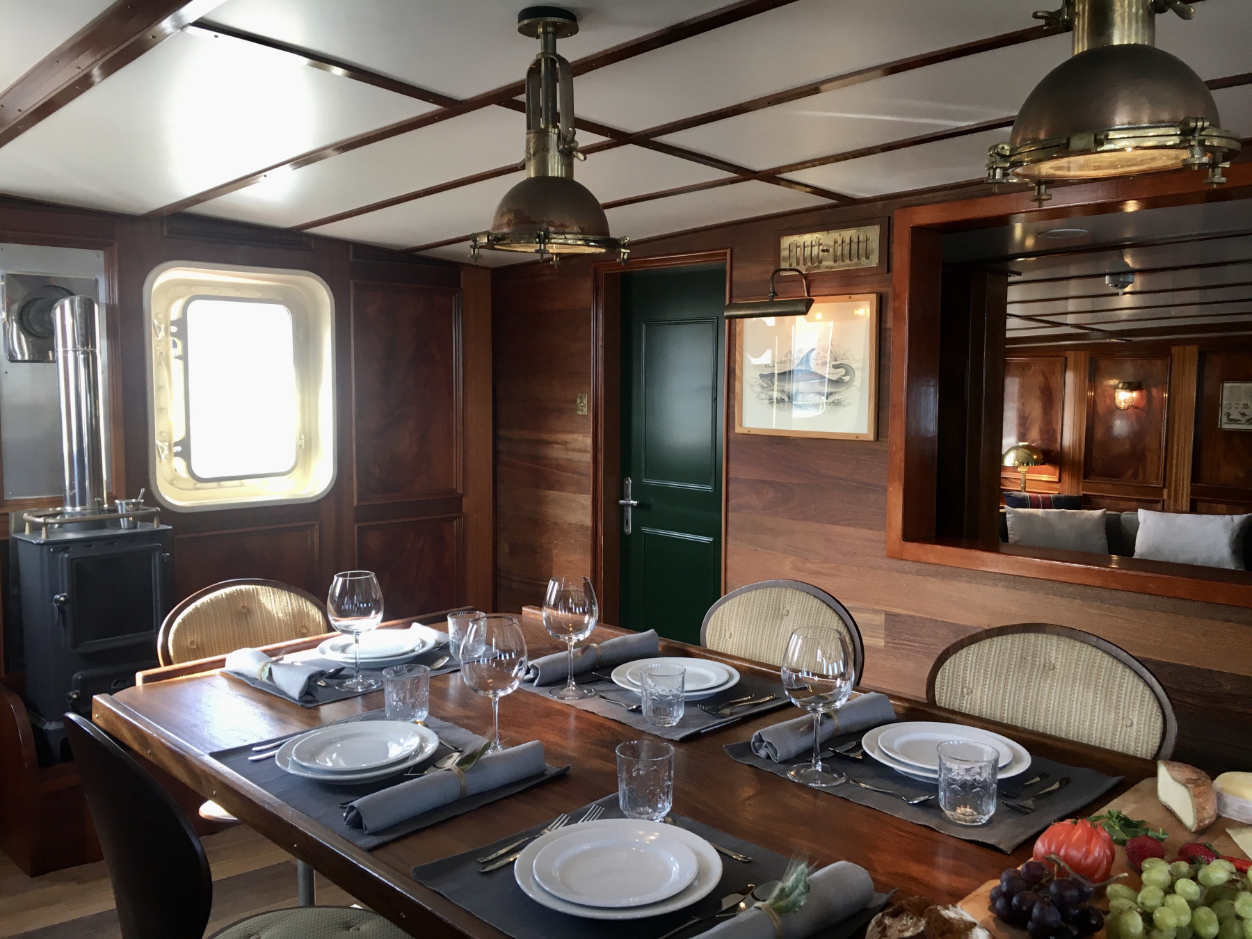 Sur le pont des invités se trouve un petit sauna avec une douche froide. Le salon richement meublé et la belle salle à manger sont dotés de lambris en acajou, d'un bar, d'une bibliothèque et de stations de café et de thé.